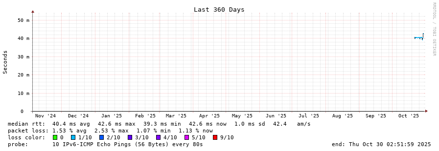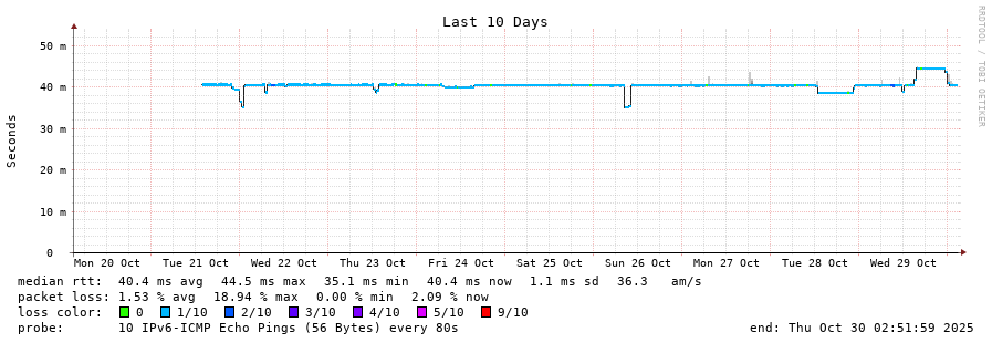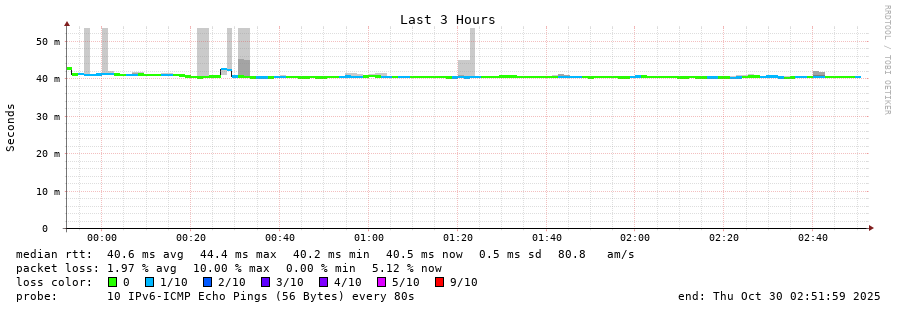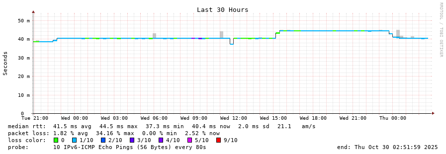 traceroute to 2001:4350:1:1::ff90 (2001:4350:1:1::ff90), 30 hops max, 80 byte packets - Generated at 2025-10-29 18:30:01