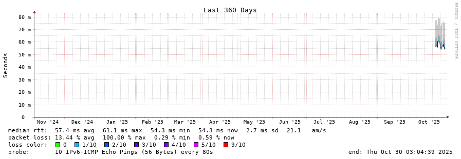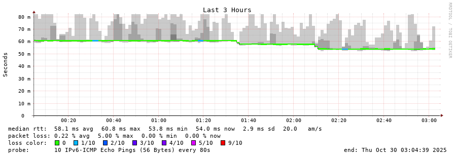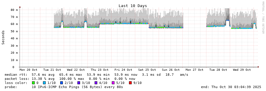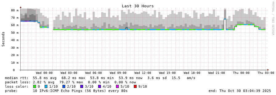 traceroute to 2001:470:1f13:814:1ad6:c7ff:fe2a:502 (2001:470:1f13:814:1ad6:c7ff:fe2a:502), 30 hops max, 80 byte packets - Generated at 2025-10-29 10:30:01