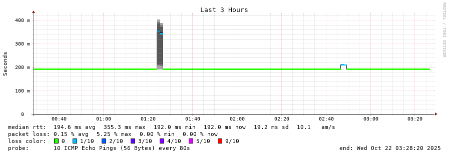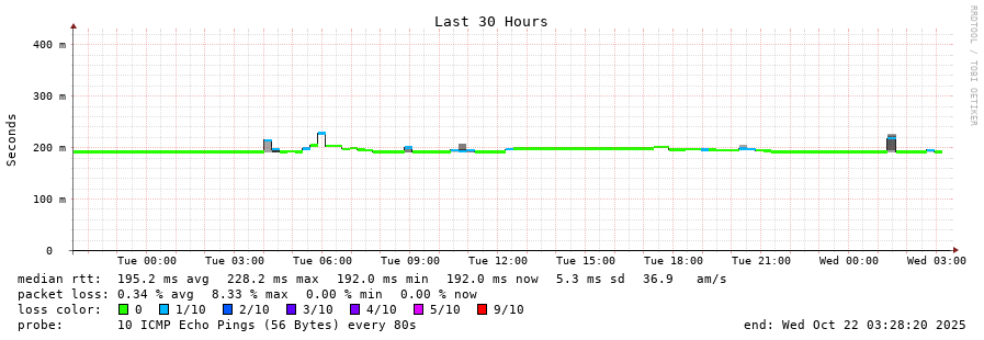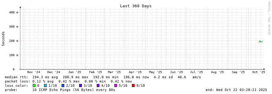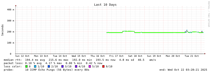 14 > 200.25.56.95 (200.25.56.95) [AS7195] 185.078ms 185.153ms 185.210ms
